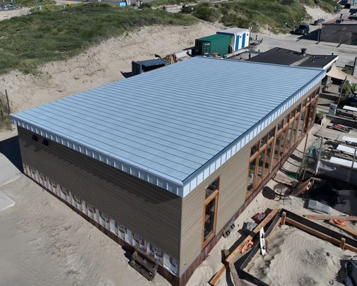 Zon, zee, strand, surfen, een ontspannen sfeer en lekker eten. Beachclub Makai in IJmuiden combineert dit alles onder één dak. Een speciaal dak, de eigenaar maakte de keuze voor een lichtgekleurd felsdak in het materiaal PRISMO brushed white+. Het dak van ca. 200m² is zeer vlak en moest daarom uitgevoerd worden met dubbel gesloten felsnaden voorzien van dichtingsband. De felsbanen hebben een lengte van ruim 11 meter en zijn ter plaatse, op het strand, geprofileerd. Dit letterlijk en figuurlijke ‘coole’ dak zorgt voor een unieke uitstraling!