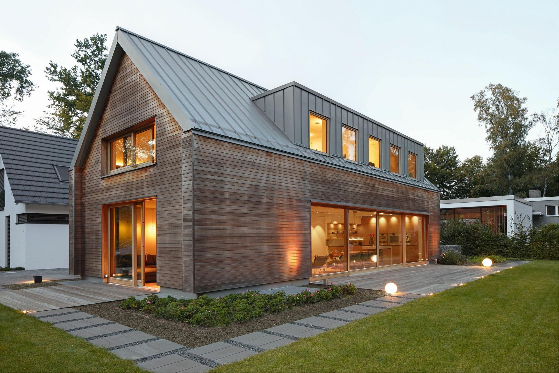 A modern interpretation of the Bergisch house was used to create a single-family home in Ratingen, North Rhine-Westphalia. The combination of classic titanium zinc and warm wood creates a special effect. The building, which is networked by means of a home automation system, has a total living area of 283 m². The roof was clad over an area of 180 m² with RHEINZINK-prePATINA blue-grey in an angled standing seam system, while the wooden façade is made of Douglas fir. The attractive contrast was not the only reason for choosing these materials. Because both RHEINZINK-prePATINA and wood are durable and environmentally friendly, and therefore perfectly suited for sustainable construction.